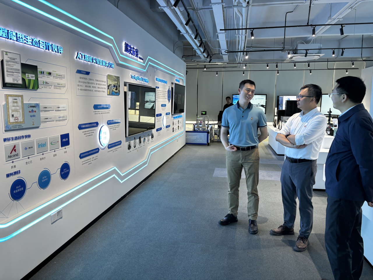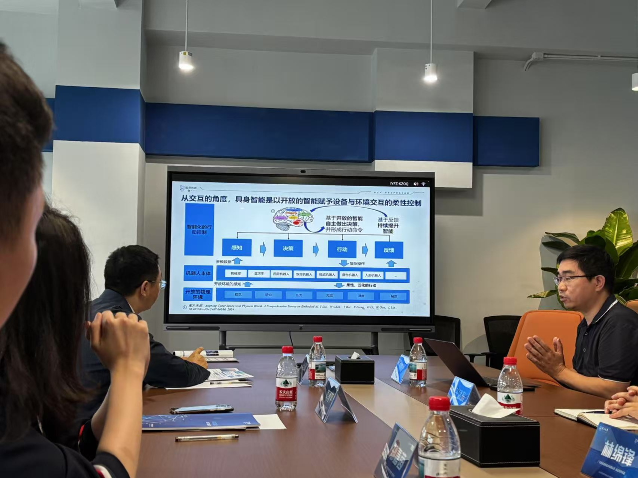 随后师生们进入到图灵智新展厅中参观,在展厅中,图灵智新公司合伙人王武东围绕公司发展历程、主营业务与技术优势对学院师生进行了详细的讲解。展厅陈列了图灵智新公司自主研发的硬件与软件成果,展示了公司在具身智能领域从传感、感知、决策到执行的闭环能力,以及与百度、NVIDIA等行业巨头的协同合作模式。师生们对于图灵智新公司有了更清晰准确的了解。