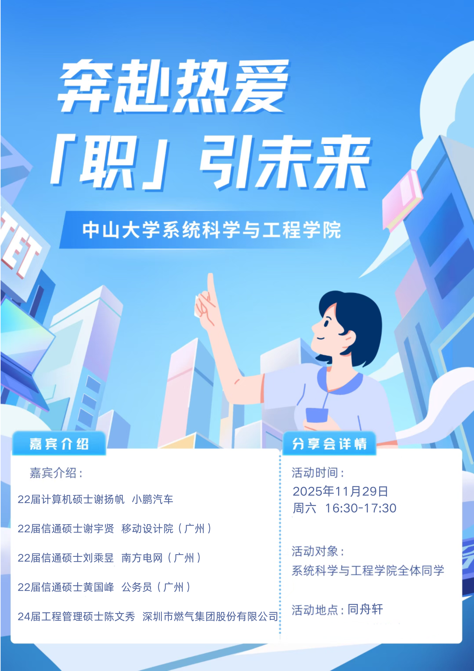 为帮助同学们更好地认知不同岗位就业发展可能性,做好求职方向规划,我们本次诚挚邀请多位毕业生,围绕私企实习、求职心得、国央企求职经验、公务员考试经验分享等主题进行经验分享,并与同学们互动交流、答疑解惑。